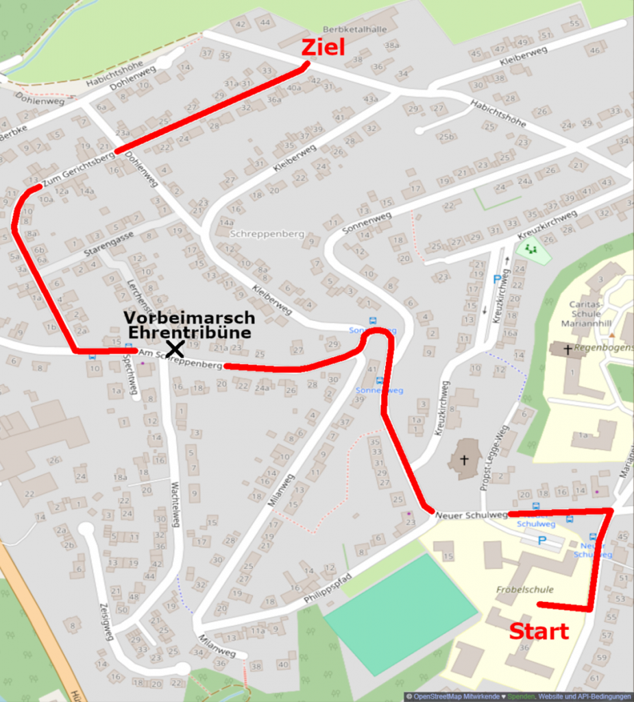 Während des Festzuges sind die Zufahrts- und Seitenstraßen in der Zeit von 15:30 Uhr bis ca. 17:00 Uhr rund um den Marschweg für den regulären Straßenverkehr gesperrt!